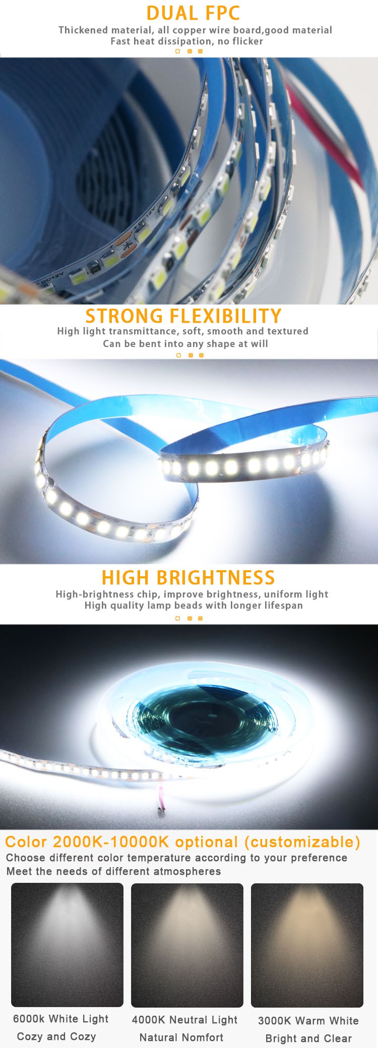 The flexible design allows for easy installation on curved or uneven surfaces, and the strong adhesive ensures that it will stay in place. The 180 lamps per meter provide a bright and even light, creating a warm and inviting atmosphere in any room. The dual FPC material ensures durability and long-lasting performance. The packaging includes 500 meters per carton, making it ideal for large-scale projects. The dimensions of the carton are 38*36*21cm, and the weight is 6.95kg/ctn, making it easy to transport and store. This lamp bar is a great choice for anyone looking for a flexible and reliable solution for indoor lighting.