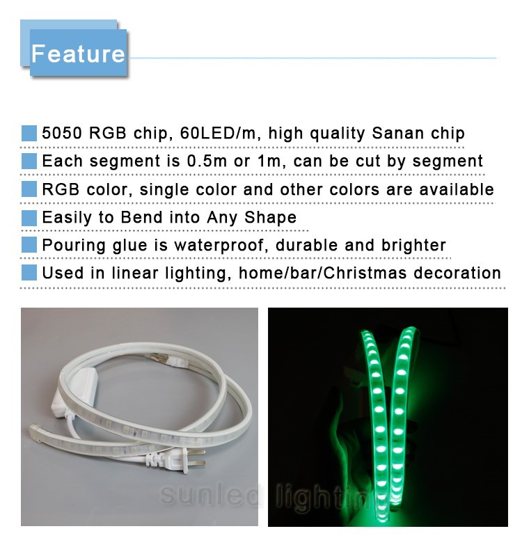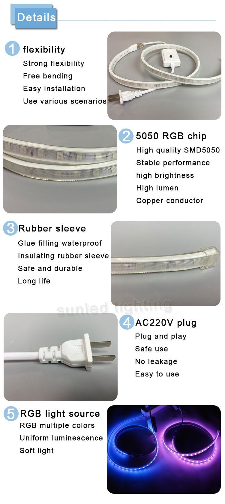 High -pressure 5050 RGB LED belt is a flexible lighting bar. The strip is powered by high -voltage power, which can be controlled, allowing a series of color combinations and effects. You can customize strips for any space, and are usually used for home decoration, commercial lighting and stage lighting.