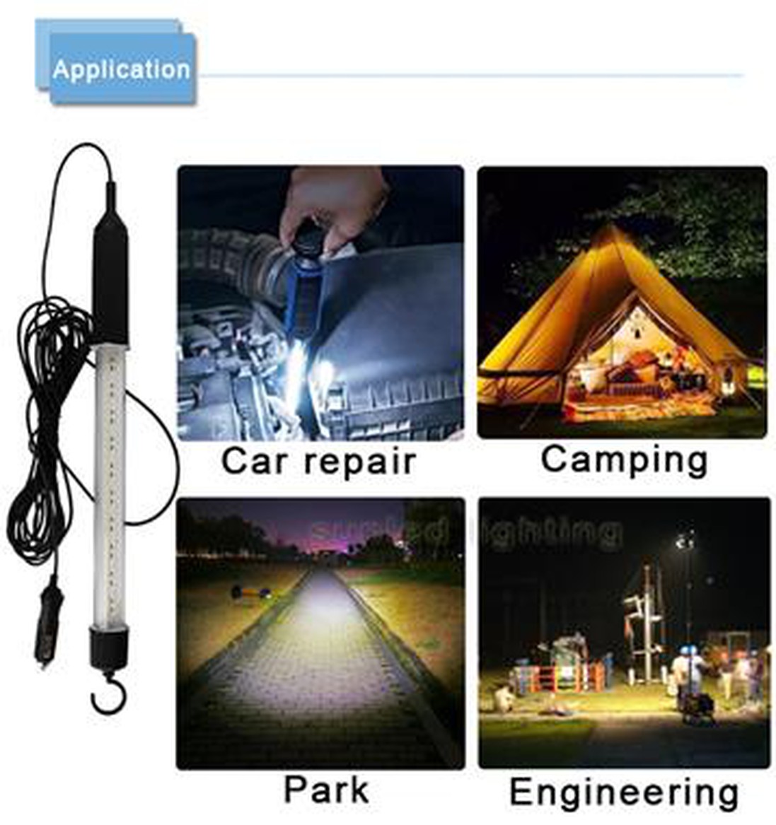 It consists of a handle and lamp head with LED lamp beads, which can provide bright and uniform lighting effects and help improve work efficiency. These work lights typically have multiple lighting modes (such as high, medium, low, flashing, etc.), are easy to control, and can be powered by rechargeable batteries or an external power source. In addition, it is also waterproof, shock-resistant and durable, enabling users to obtain stable lighting effects in various harsh environments. |