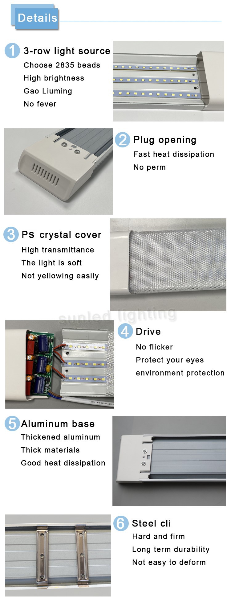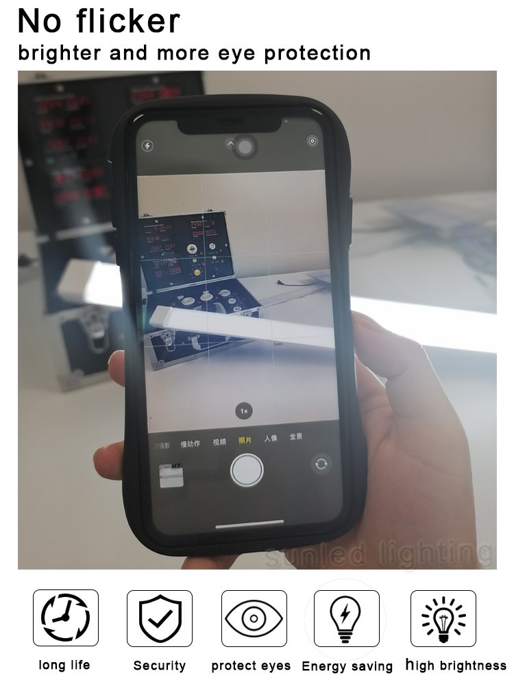 The size is 1.2m long, the width is greater than equal to 7.5cm 2. The power is 70W ± 10%, the PF> 0.6 voltage AC220-240V, the light effect 90-100LM/W without flash 3, the lampshade PS Ling crystal cover, the base material is plastic, 4, There is no blue light harm. There is no blue light harm at the RG0 level. RA: 80.5, IP54 Waterproof and dustproof level 6 and 3 row lights are ranked on the aluminum -based plate. See the picture. 7. The fixed method of the lamp: The ceiling stainless steel card sitting installation 8. Sample color temperature: 6500K