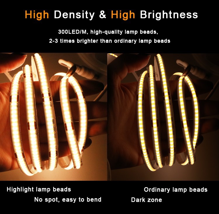 COB LED Strip kit, Good solution for linear light. It perfectly achieves the Dot-Free lighting effect even if without any profile or PC cover.Continuous and uniform linear illumination, with soft and elegant light, no glare. Adopt Flip-Chip technology, no dead light risk.