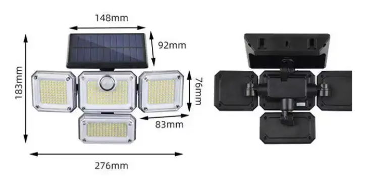 5,Four Heads Wide Angle Illumination.The solar panel is adjustable to maximize sunlight absorption from every angle. The solar flood light features four adjustable light heads, a wide 270° lighting angle, and a 16-foot sensing distance, ensuring extra brightness and an extensive visible area.